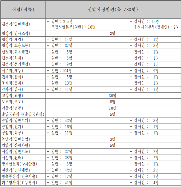 7급 공무원은 총 780명을 선발합니다. 2020년에는 총인원 755명을 뽑았습니다. 전년에 비해 약간 상승한 것을 알 수 있습니다.