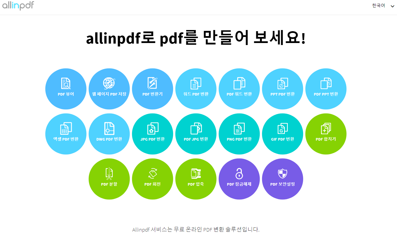 pdf jpg 변환을 해주는 사이트 중 하나인 allinpdf는 jpg로 변환해주는 것 이외에도 여러가지 작업을 할 수 있습니다. 맨처음 영어로 되어있어 사이트 이용이 불편할거라 생각했지만, 다행스럽게 한국어도 지원을 합니다. 사실 어려운 영어도 아니라 쉽게 이용이 가능한 사이트입니다.