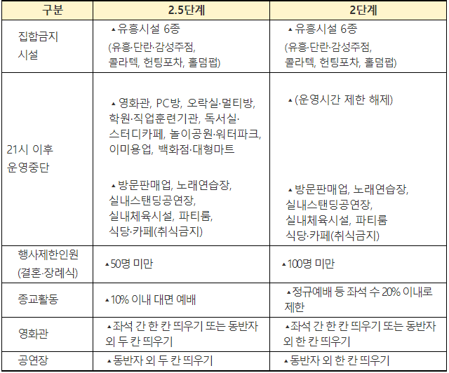 철도승차권은 창가 좌석만 예매가 가능하며, 고속도로 휴게소에서 실내 취식을 금지하고 포장만 가능하다고 합니다. 종교시설, 소모임 등도 계속해서 일절 금지됩니다. 일부 다중이용시설 운영시간도 21시 이후에는 계속해서 금지가 됩니다.