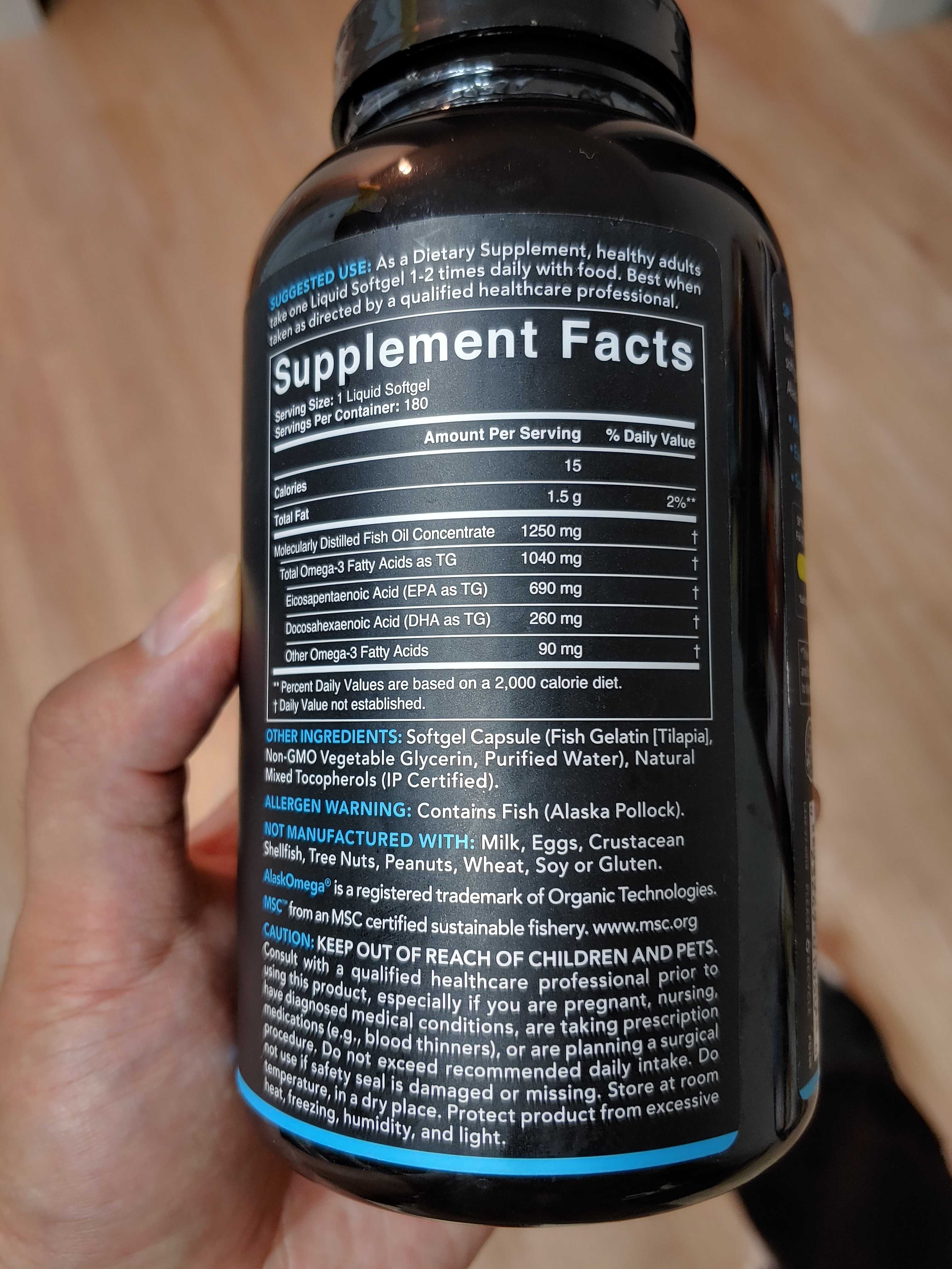 EPA가 690mg, DHA가 260mg 들어가 있습니다. 총 950mg의 함량을 보여줍니다. 총용량이 1250이니 76% 정도의 순도를 보여줍니다. 성인 기준으로 하루에 700mg에서 1000mg 그램 정도의 오메가 3을 권장 섭취하도록 하고 있습니다.(흡수율을 고려해 여러 알, 2~3알을 드시는 분들도 계시는 걸로 알고 있습니다. 이 부분은 개인에 맞게 양을 조절하시면 될 것 같습니다.)