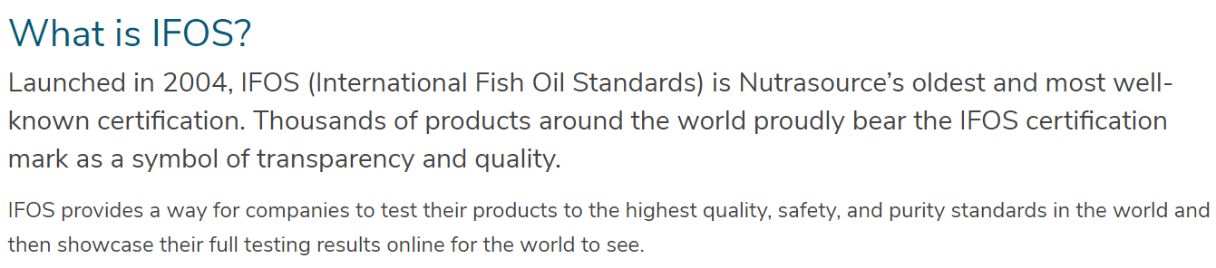IFOS는 제품의 퀄리티를 인증해주는 인증 회사라고 합니다. 이 제품의 퀄리티, 안정성, 순도에 대해 테스트를 거쳐 등급을 매겨주는 것 같습니다. 오메가 3에 대해서는 권위 있는 검증기관이라는 것을 본 것 같습니다.