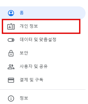3. 왼쪽 화면에서 두 번째 위치한 개인정보를 클릭해줍니다