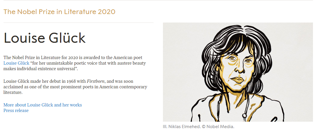 스웨덴 한림원은 10월 8일 2020년 노벨 문학상을 발표하였습니다. 수상자는 미국 시인 루이즈 글릭입니다.