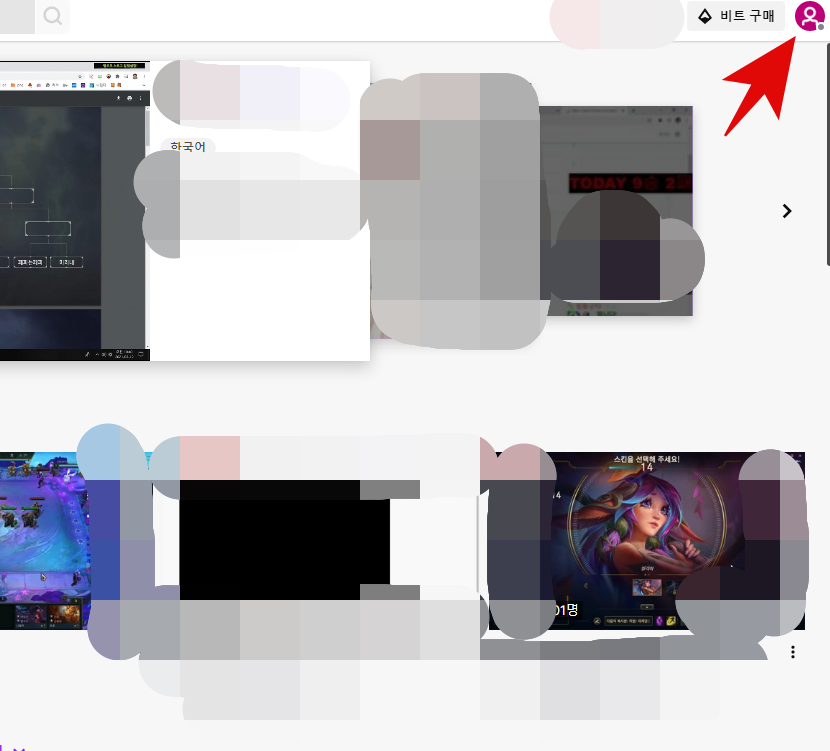 1. PC에서 트위치를 접속하면 위와 같은 화면이 나옵니다. 오른쪽 상단 구석을 보면 프로필 아이콘이 있습니다. 먼저 프로필을 클릭합니다.