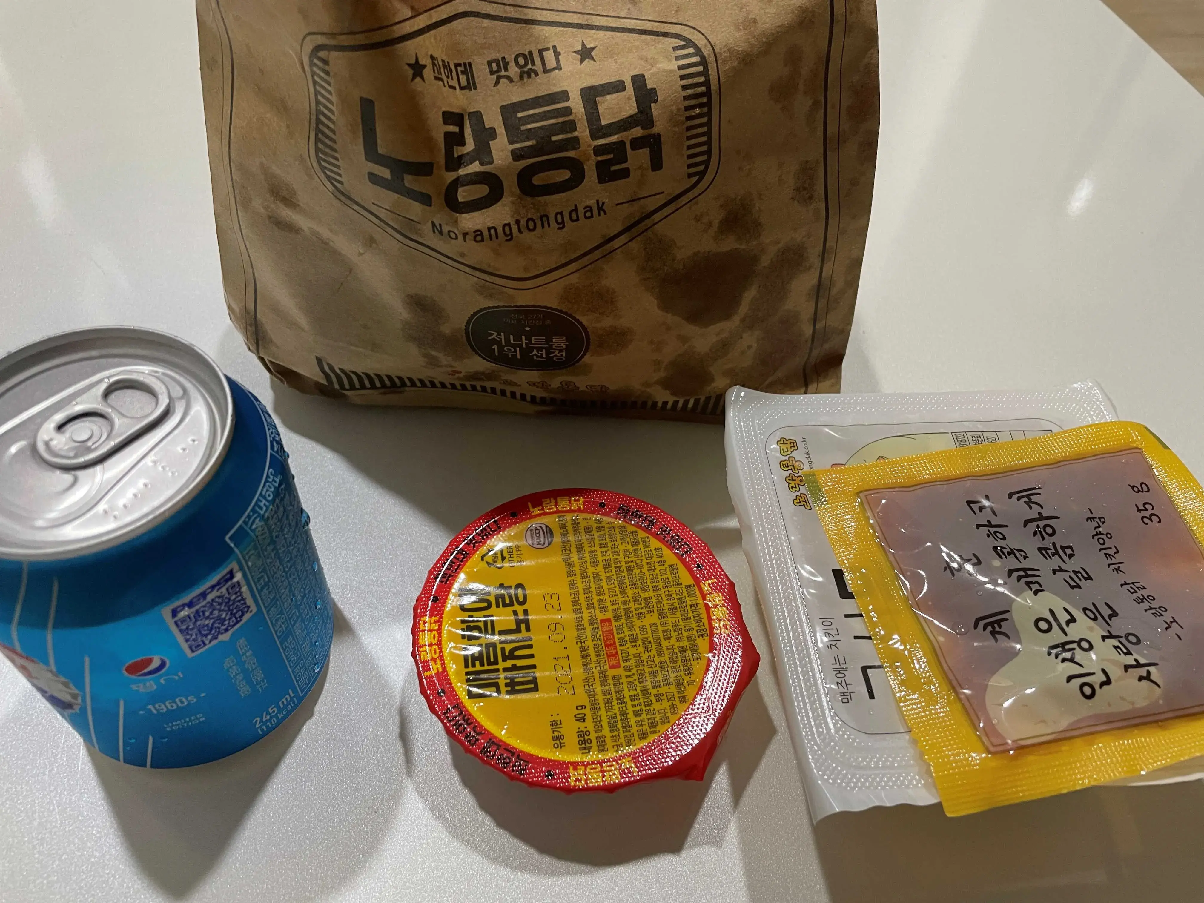 저는 순살로 시켰고, 치킨, 소스, 치킨무, 콜라가 함께 배달되어 왔습니다.