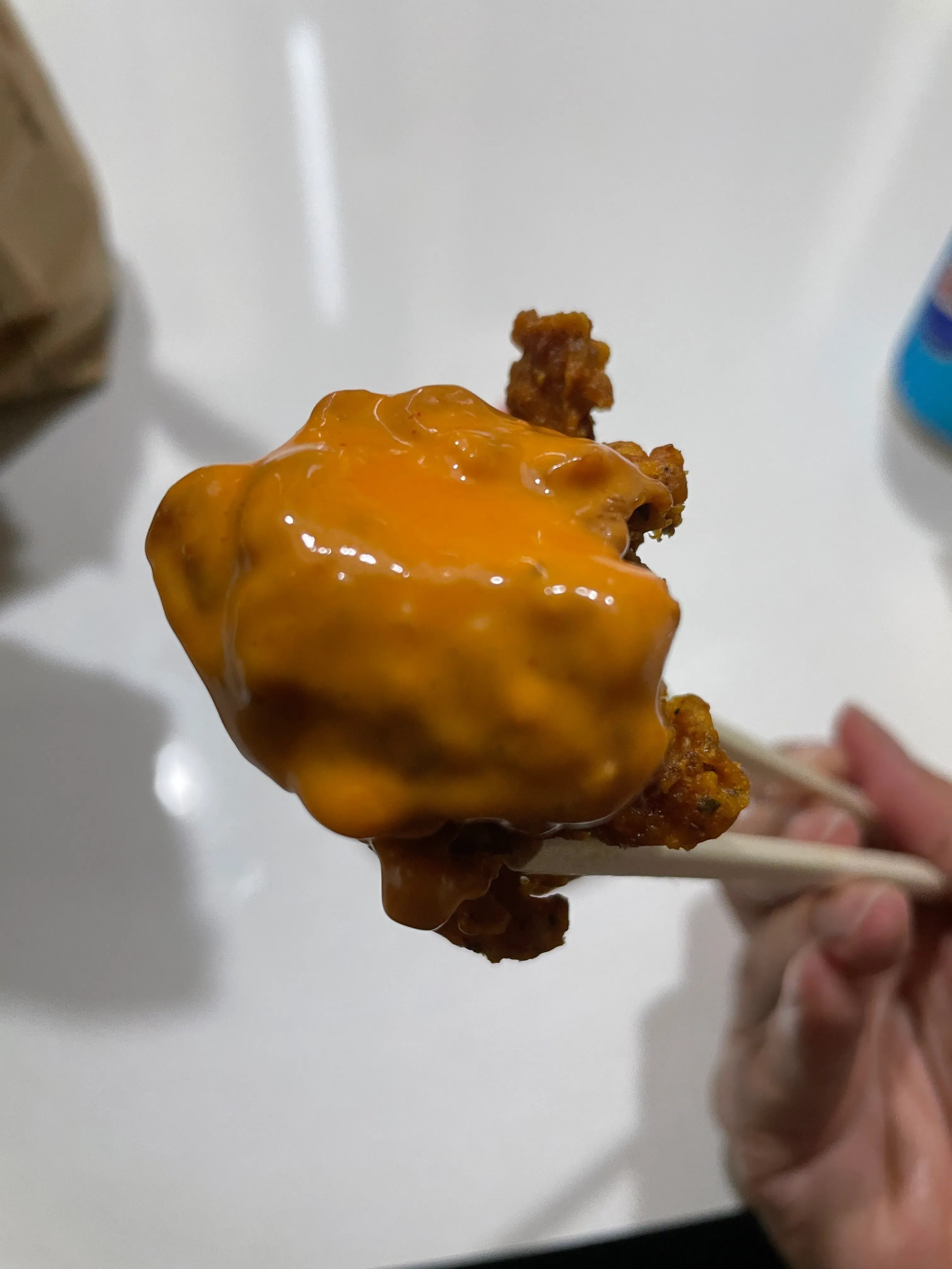 함께 제공되는 소스는 전혀 맵지 않습니다. 굽네치킨에서 제공되는 고 블링 소스와 맛이 비슷합니다. 사실, 먹으면서 '이 치킨 굽네치킨 고추바사삭이 더 매워진 버전의 치킨 같다'라는 생각이 들었습니다. 강화된 고추맛을 통해 매운맛을 좋아하는 사람의 취향 저격을 노린 것 같았습니다.