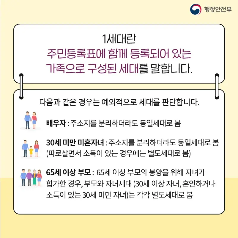 가족 구성원이 세대를 분리하려면 거주지가 달라야 합니다. 부모와 자식으로 이루어진 가정이라면 부모님과 다른 곳에 살아야 분리가 가능합니다. 물론, 같은 거주지에 함께 살아도 분리가 되기도 합니다. 출입하는 문이 따로 되어 있는 공간에 각각 살고 있다면 가능하기도 합니다.