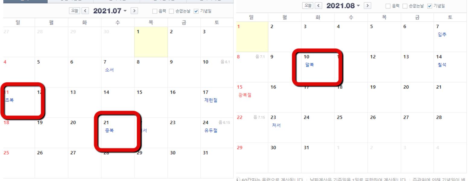 2021년 초복, 중복, 말복은 언제일까요? 초복은 7월 11일, 중복은 7월 21일, 말복은 8월 10일입니다. 초복과 중복은 7월이고 말복은 8월이네요.
