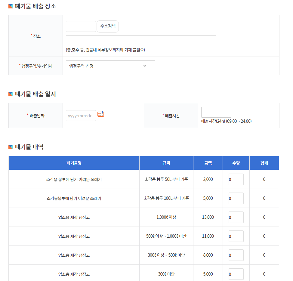 4. 배출 시간과 장소를 선택한 후, 자신이 버리려는 쓰레기 종류를 선택한 후에 결제를 하시면 됩니다. 결제를 하시면 스티커를 출력할 수 있는 화면이 나오며, 이를 출력하여 쓰레기에 부착하여 버리기로 한 장소에 두시면 됩니다.