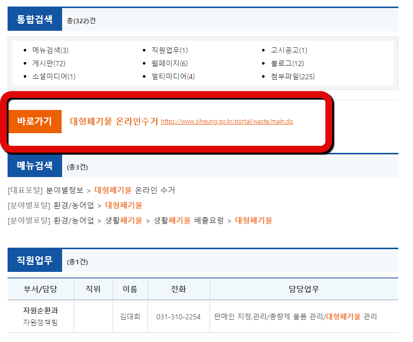 1. 자신이 거주하고 있는 지역의 구청 홈페이지에 들어갑니다. 저는 시흥시에 거주하고 있기 때문에 검색창에 [**시흥시 폐기물 스티커**]라고 검색하였습니다.