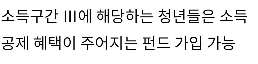 소득구간 Ⅲ에 해당하는 청년은 소득공제를 받을 수 있는 펀드나 금융 상품에 가입할 수 있도록 돕는다고 합니다. 직접적으로 돈을 제공하는 것이 아니라 간접적으로 지원할 것으로 예상됩니다.