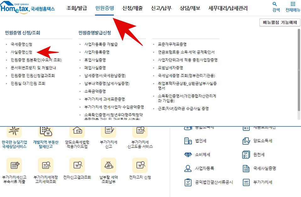 위의 메뉴 선택에서 [**민원증명**]을 누른 뒤 [**사실증명 신청**]을 눌러줍니다.