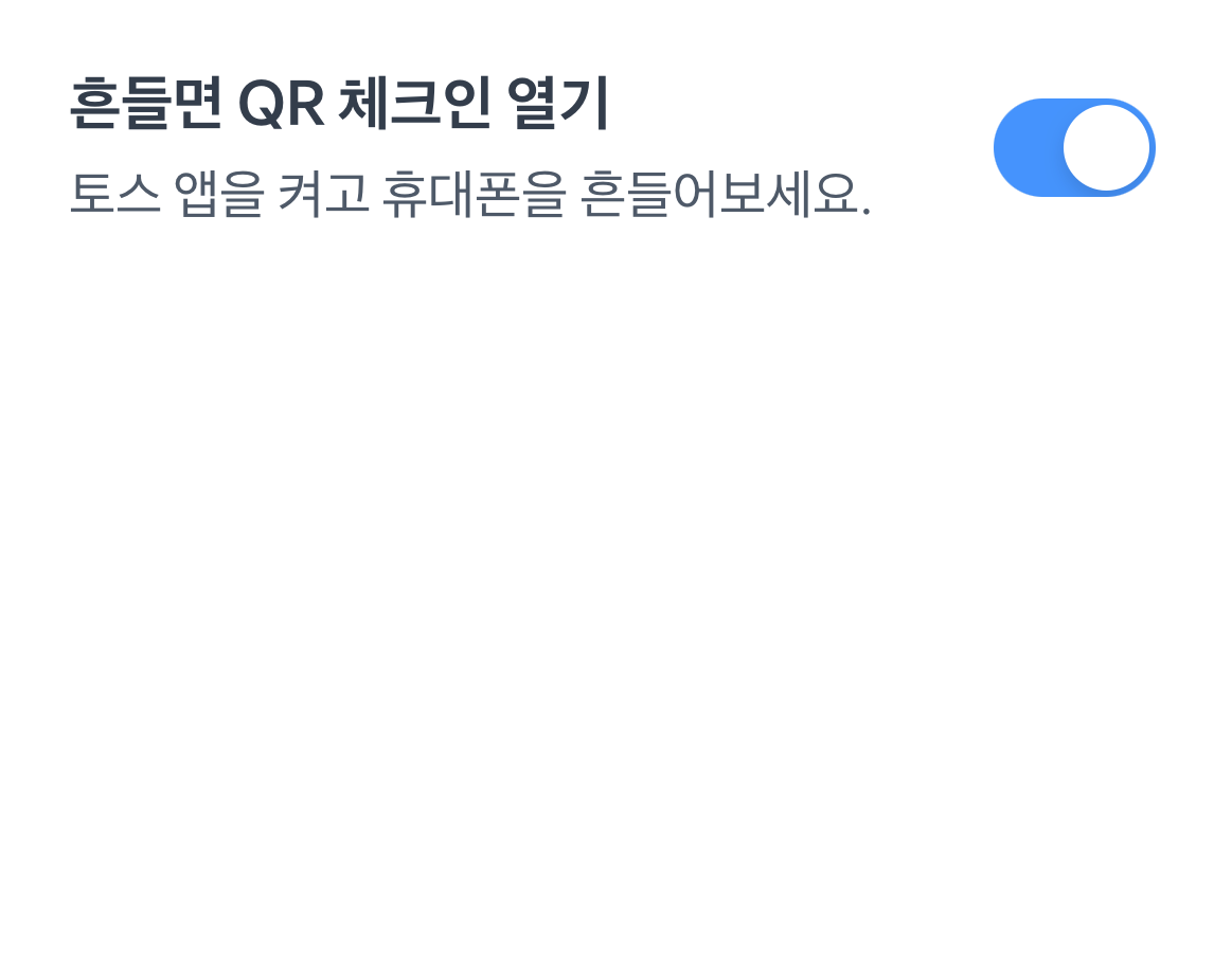 ▲ 흔들면 QR 체크인 열기는 설정에 들어가시면 설정하실 수 있습니다. 토스 어플을 실행하고 바로 휴대폰을 흔들면 QR 코드가 뜨게 됩니다. 만약 급하게 QR 체크인을 이용해야 하는 상황이 많으시다면 이 기능을 활성화하시고 이용하시면 편리하게 체크인이 가능할 것 같습니다.