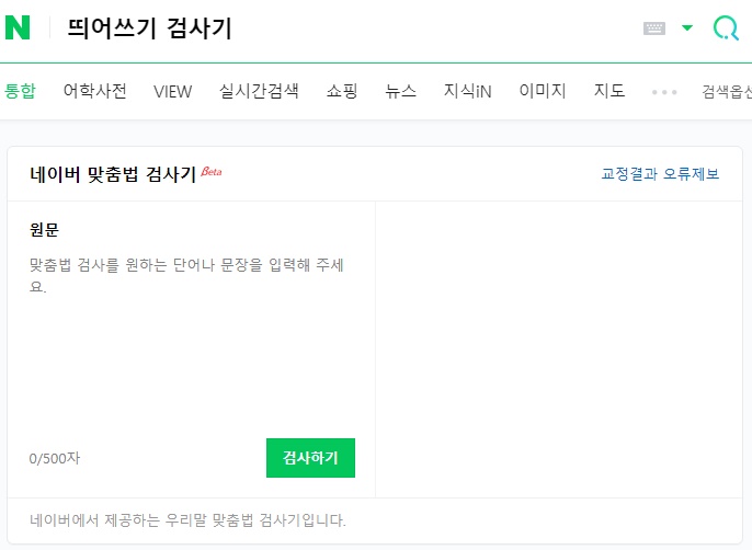 네이버에서 제공하는 띄어쓰기 검사기입니다. 많은 분들이 이용하는 사이트인 네이버에서 제공하는 검사기로써 많이들 이용하고 계실 거라 생각됩니다.