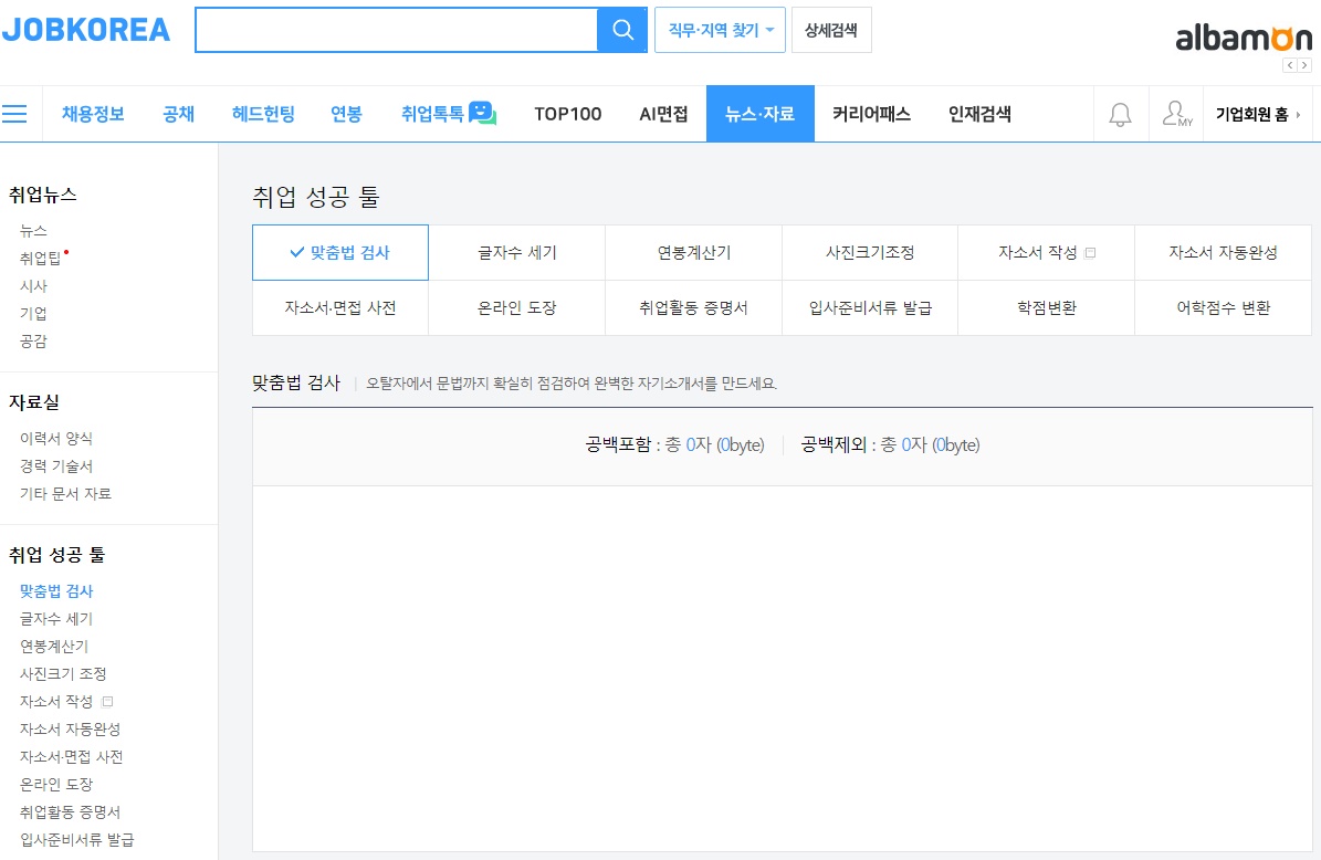 취직 정보를 얻을 수 있는 잡코리아에서 제공하는 띄어쓰기 검사기입니다. 보시면 아시겠지만 띄어쓰기, 문법 검사 이외에도 여러 가지 다양한 툴을 제공합니다. 취업준비를 하시는 분이라면 한번 이용해보시면 좋을 것 같네요.