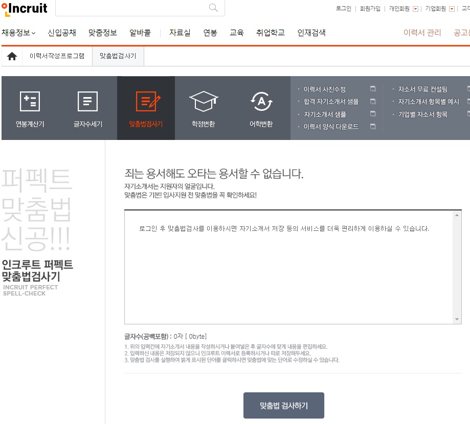 맞춤법검사는 기본! 이력서 및 자기소개서에 오타, 띄어쓰기, 외래어의 잘못된 표기 검사를 한번에! 글자수세기 | 맞춤법검사 | 학점변환 | 어학변환 기능을 인크루트 취업지원프로그램에서 이
